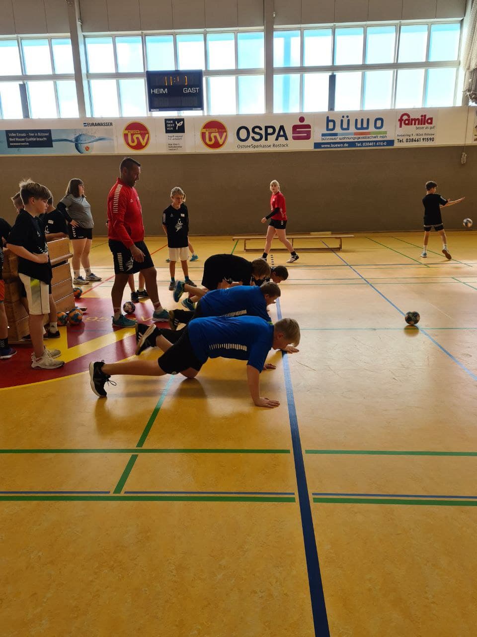 Wie schon ein Jahr zuvor, hat Chrischa Hannawald mit seinem Trainerteam erneut in diesem Jahr den Weg in die Bützower Sporthalle gefunden und 37 Kindern aus Laage, Dorf Mecklenburg, Güstrow und Bützow über verschiedenste Übungsformen weitere Feinheiten des Handballsports beigebracht. Vom 5.-7. Oktober 2021 gestaltete die „Handballschule Chrischa Hannawald“ jeweils von 9 bis 16 Uhr ein Handballcamp unterstützt durch hiesige Handball-Engagierte. Aus dem Trainerstab waren Anne Behning und Katrin Schwarzfeld und aus der weiblichen Jugend B Pia und Pepe mit an Bord, um Organisatorisches (Essen, Getränke etc.) oder trainingsspezifische Hilfestellungen zu leisten. Aber das Hauptaugenmerk lag natürlich bei Chrischa Hannawald und David Delp, die es von Anfang an schafften, eine Vertrauensbasis zu den Handballkids aufzubauen, indem sie auf witzige und spielerische Art Handballwissen vermitteln konnten. Neben Erwärmungsspielen, Kraft- und Koordinationsübungen kamen auch die Torhüter nicht zu kurz.
