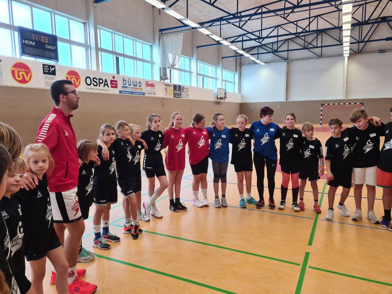 Wie schon ein Jahr zuvor, hat Chrischa Hannawald mit seinem Trainerteam erneut in diesem Jahr den Weg in die Bützower Sporthalle gefunden und 37 Kindern aus Laage, Dorf Mecklenburg, Güstrow und Bützow über verschiedenste Übungsformen weitere Feinheiten des Handballsports beigebracht. Vom 5.-7. Oktober 2021 gestaltete die „Handballschule Chrischa Hannawald“ jeweils von 9 bis 16 Uhr ein Handballcamp unterstützt durch hiesige Handball-Engagierte. Aus dem Trainerstab waren Anne Behning und Katrin Schwarzfeld und aus der weiblichen Jugend B Pia und Pepe mit an Bord, um Organisatorisches (Essen, Getränke etc.) oder trainingsspezifische Hilfestellungen zu leisten. Aber das Hauptaugenmerk lag natürlich bei Chrischa Hannawald und David Delp, die es von Anfang an schafften, eine Vertrauensbasis zu den Handballkids aufzubauen, indem sie auf witzige und spielerische Art Handballwissen vermitteln konnten. Neben Erwärmungsspielen, Kraft- und Koordinationsübungen kamen auch die Torhüter nicht zu kurz.